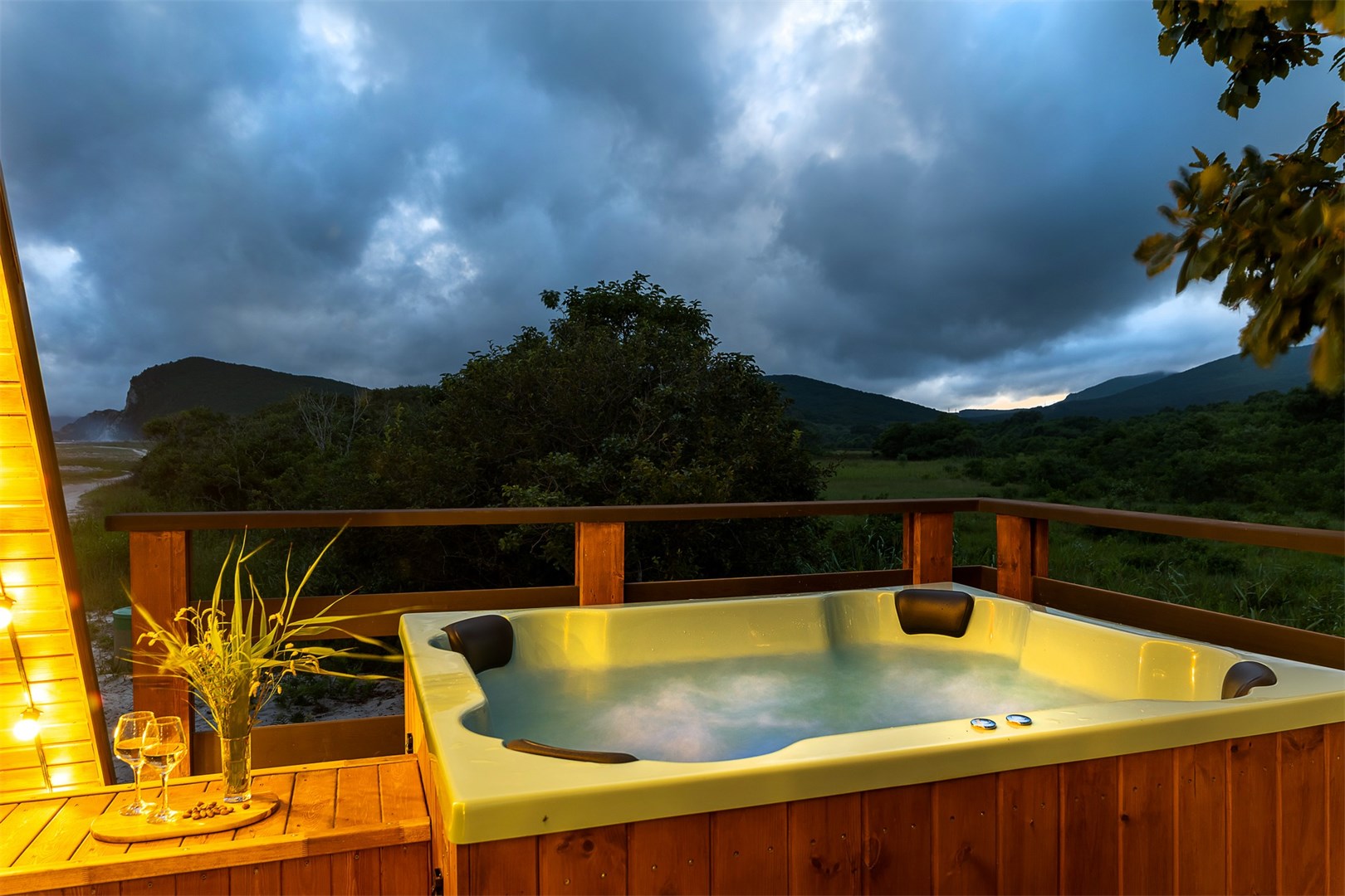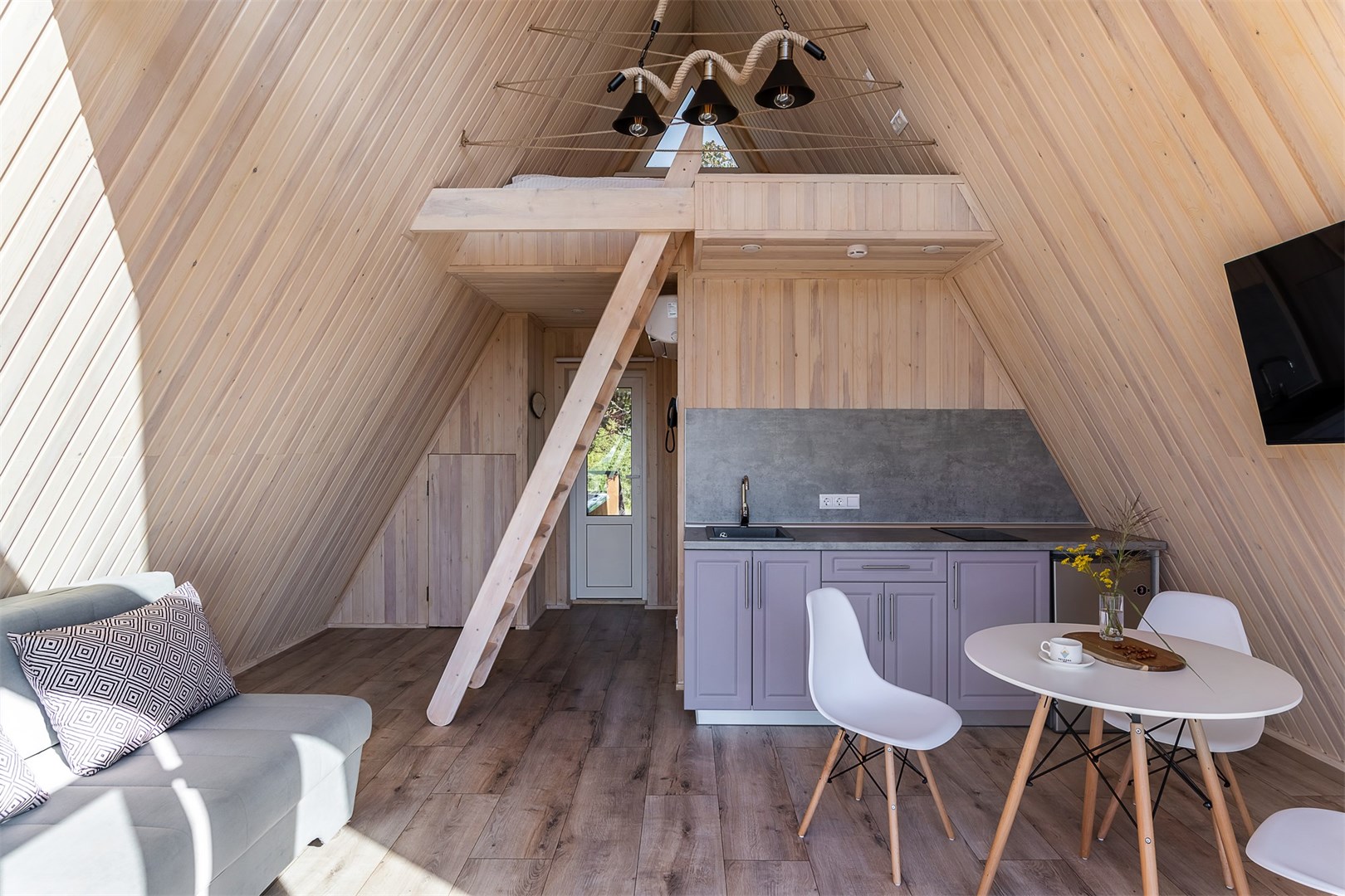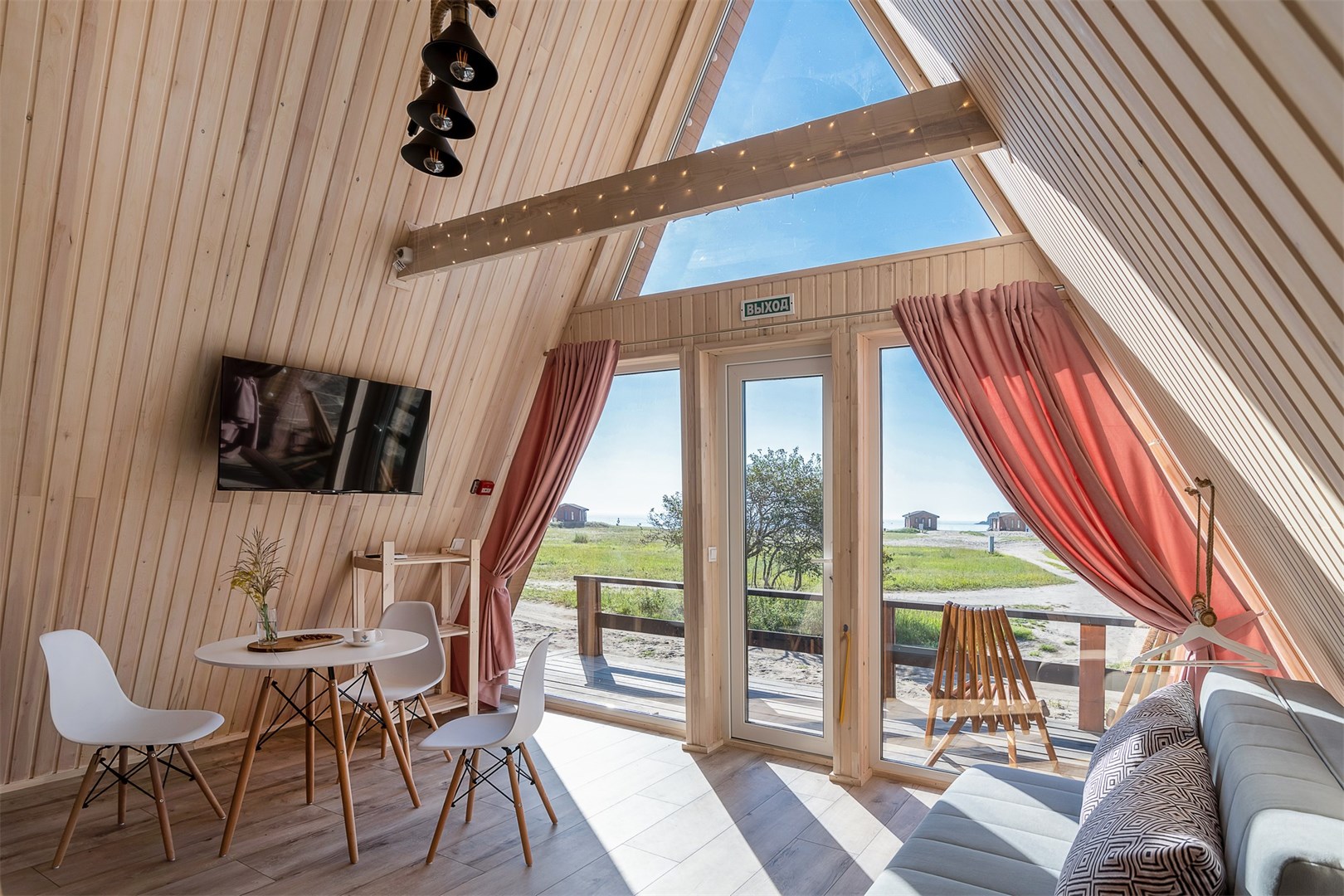 Афрейм — небольшой деревянный домик с треугольной крышей, мини-кухней и кроватью-чердаком. Панорамные окна открывают великолепный вид на бухту. В данном варианте размещения есть терраса с видом на озеро и теплой купелью и гидромассажем, а также отдельная зона для мангала.