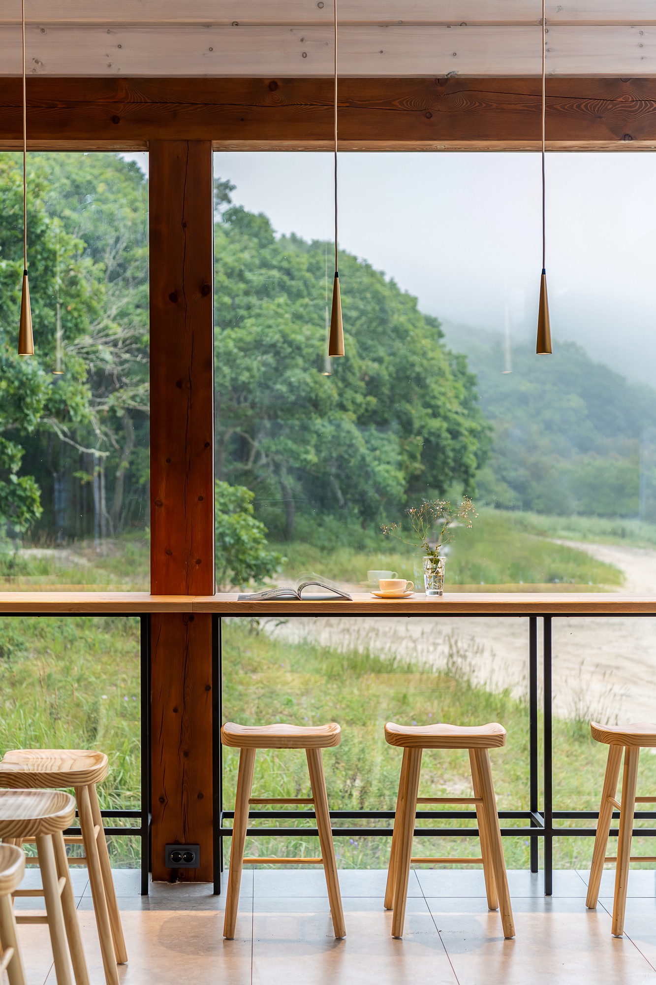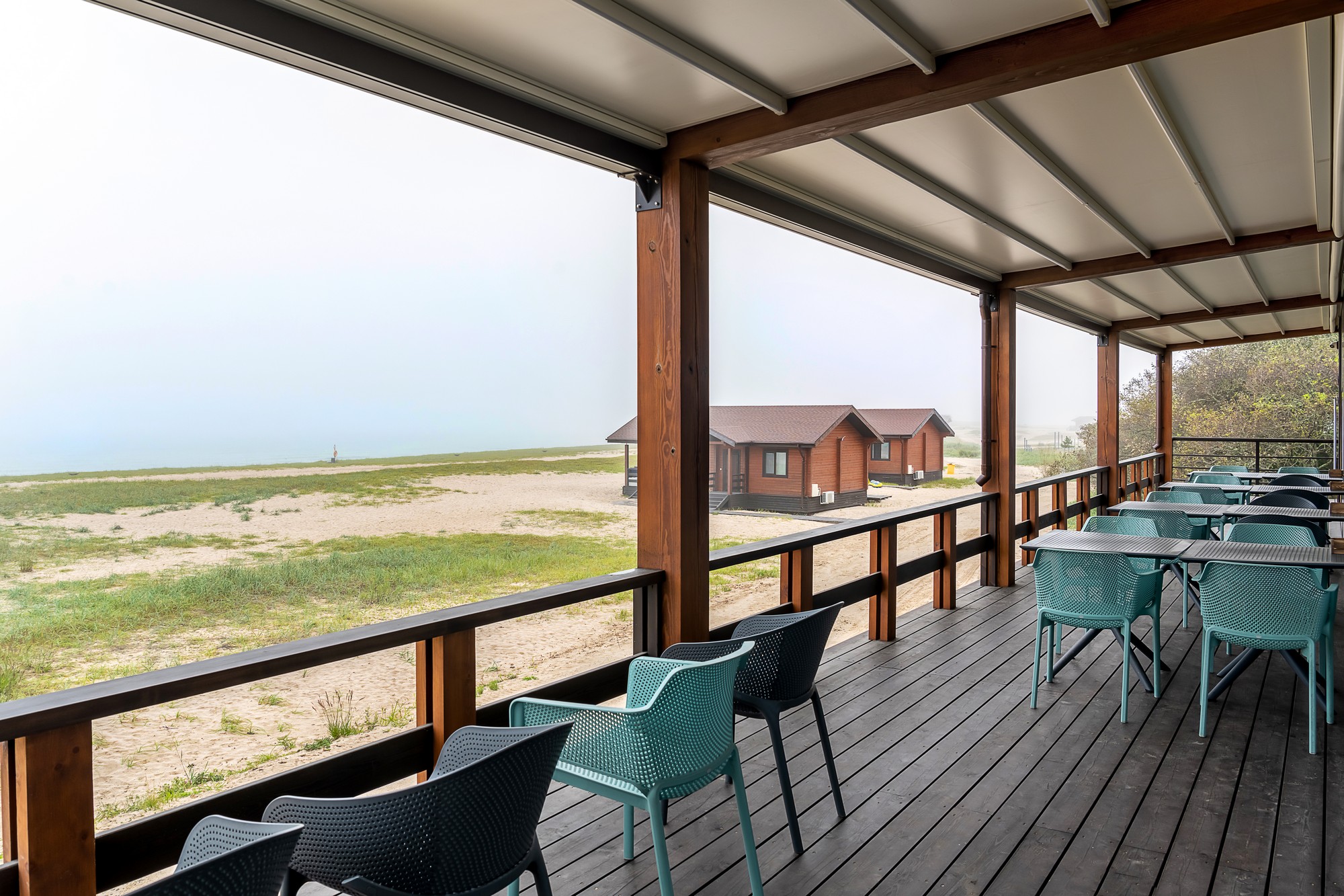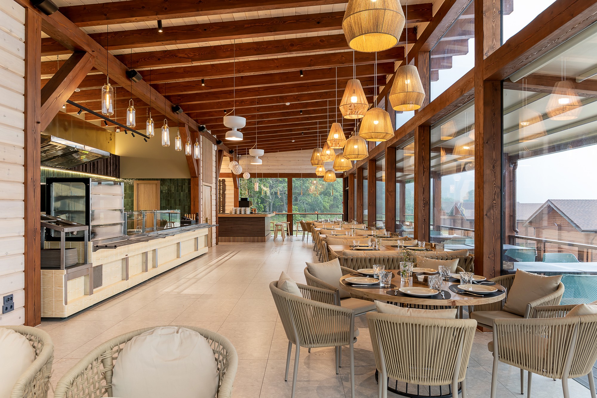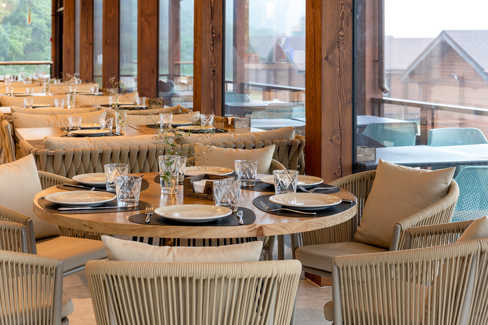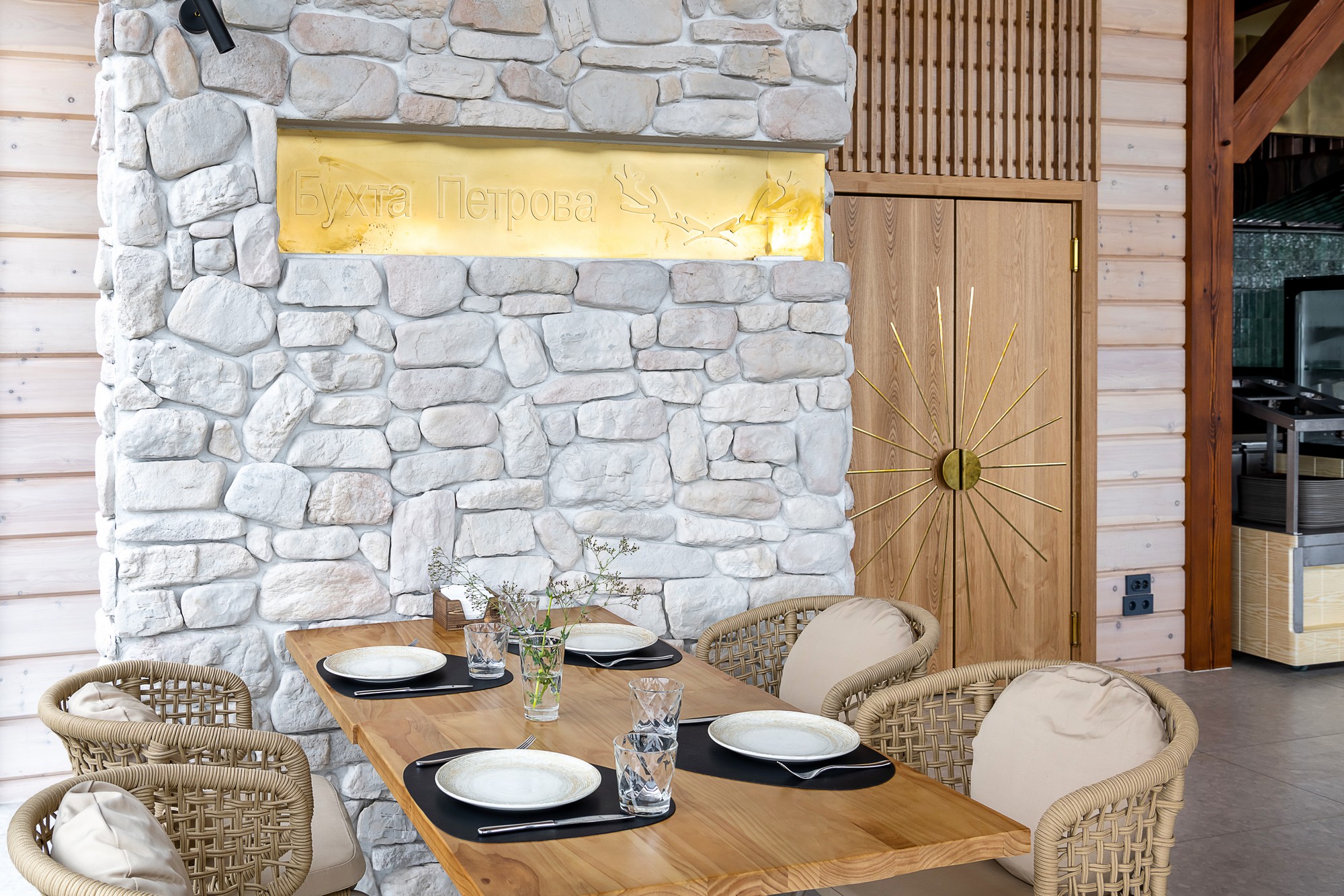 Ресторан выдержан в общем стиле комплекса – натуральные материалы, панорамные окна, прекрасный вид на бухту.